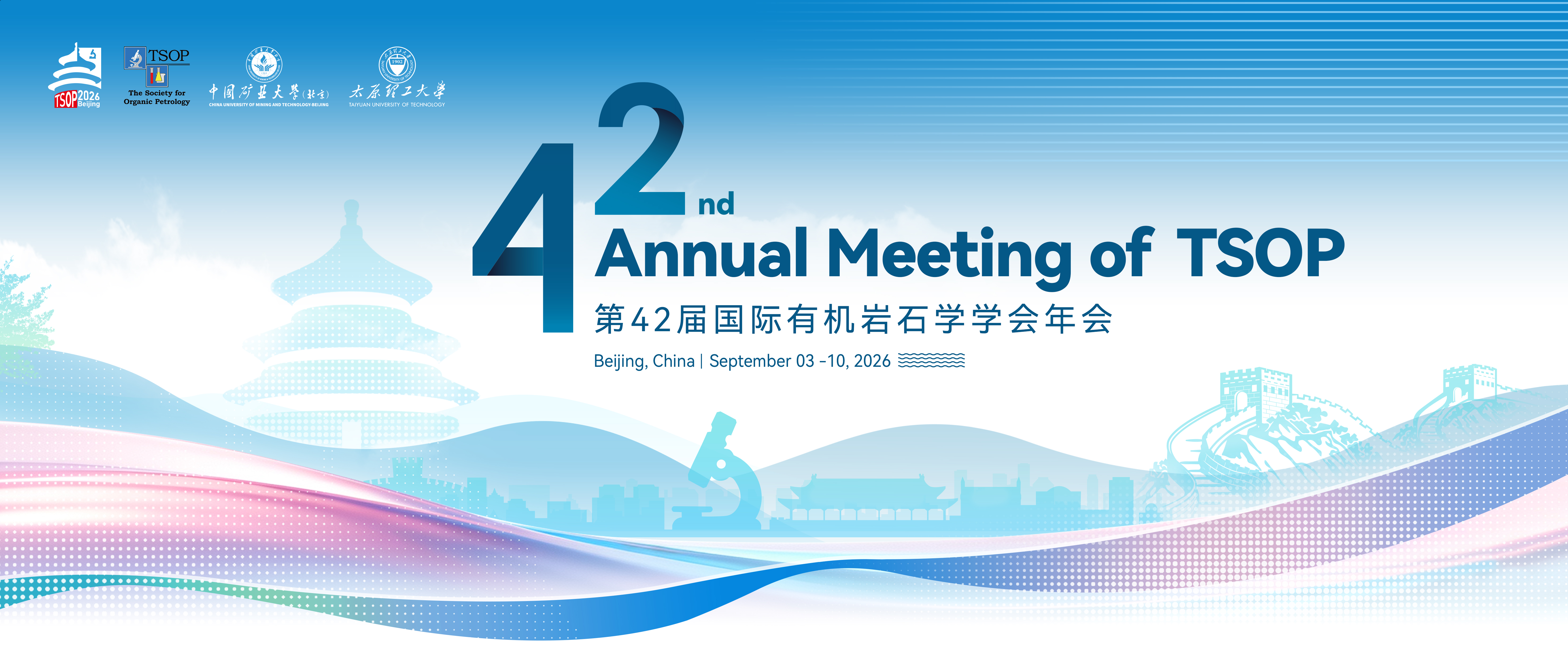 It is our great pleasure to welcome you to the 42nd Annual Meeting of the Society for Organic Petrology (TSOP 2026), to be held in Beijing, China, from September 3 to 10, 2026. This meeting is jointly hosted by China University of Mining and Technology (Beijing) (CUMTB) and Taiyuan University of Technology (TYUT). All scientific sessions and conference accommodations will be arranged at the beautiful Nirvana Resort Beijing, providing a comfortable setting for focused discussion and networking.